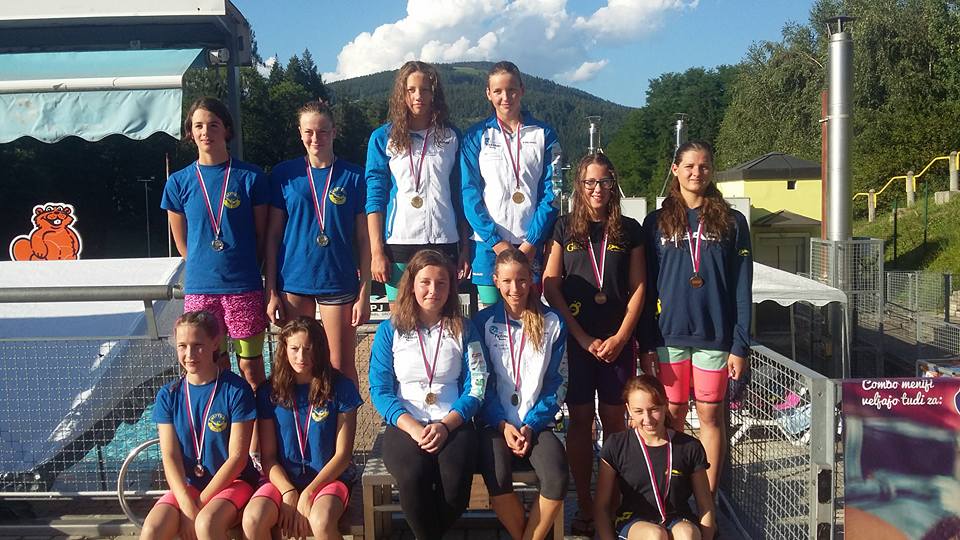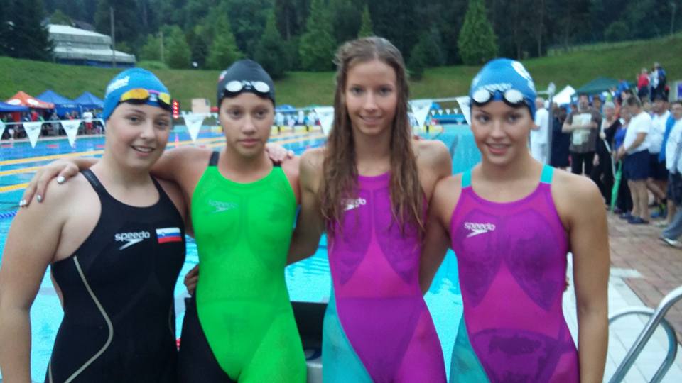Na Letnem odprtem združenem prvenstvu Slovenije v plavanju na Ravnah so si zlato medaljo priplavale Mojca in Urška Hancman, Saša Mencinger in Sara Račnik.