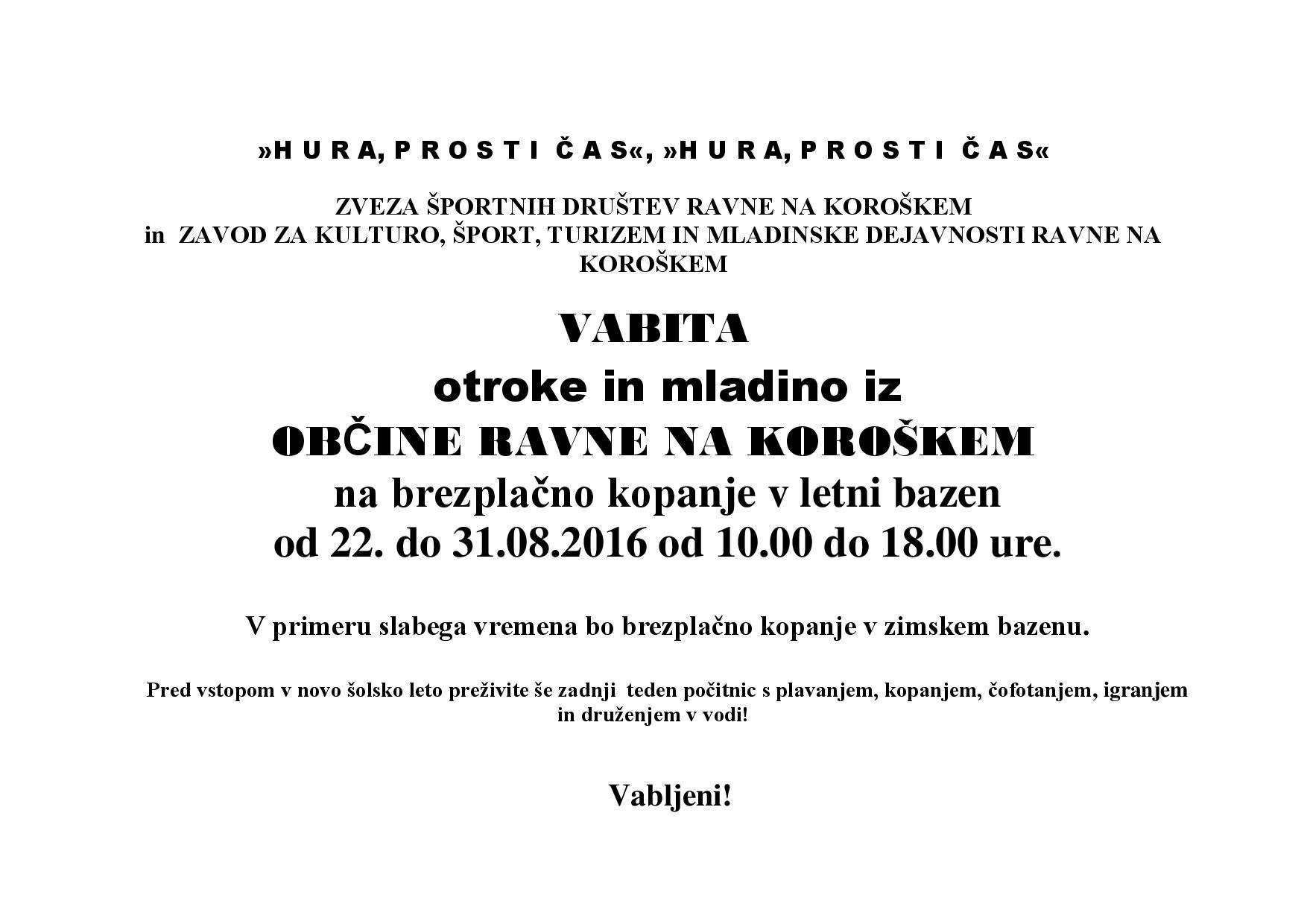 ZVEZA ŠPORTNIH DRUŠTEV RAVNE NA KOROŠKEM in ZAVOD ZA KULTURO, ŠPORT, TURIZEM IN MLADINSKE DEJAVNOSTI RAVNE NA KOROŠKEM, vabita otroke in mladino iz OBČINE RAVNE NA KOROŠKEM, na brezplačno kopanje v letnem bazenu, od 22. do 31.08.2016 od 10.00 do 18.00 ure.